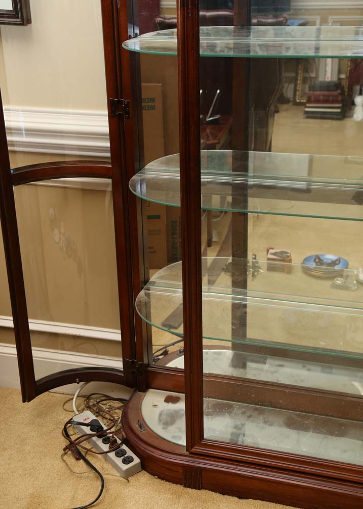 | wall wood curio cabinet curved glass sides, mirror back. We reviewed all curio cabinet styles from corner to mounted, from glass to rustic antique wood. Very unique design can fit easily into a corner. Antique curio cabinet bowed glass 3 wood shelves mirror back exc 19.25w 22.5h. Curio cabinets by howard miller are made in usa.